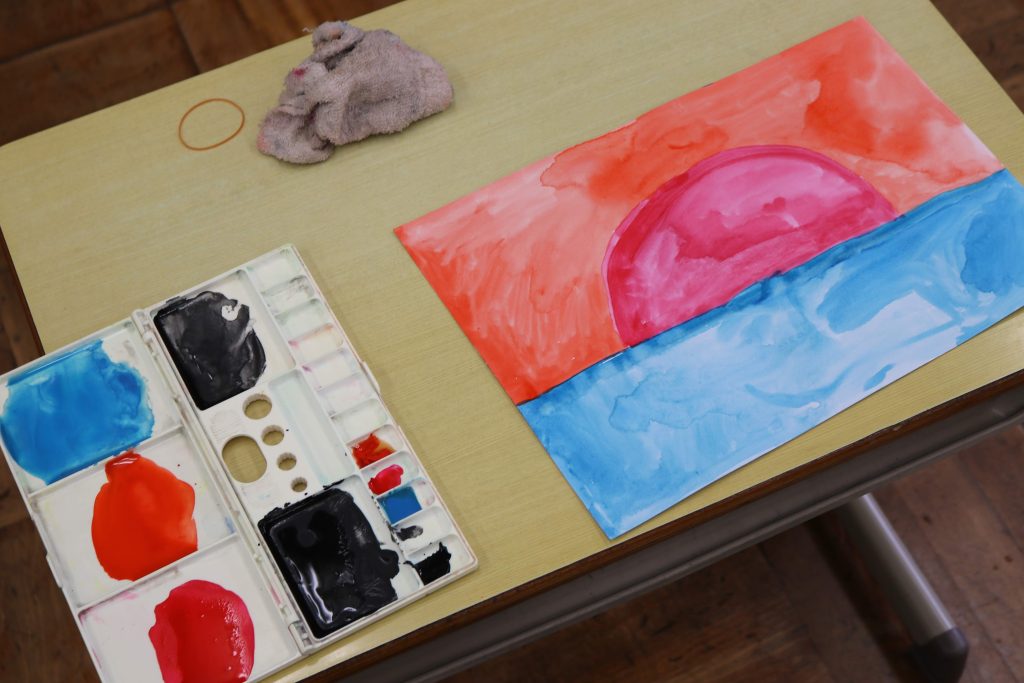 襖からくりがどんなものか分かったところで、からくりをイメージしながら自由自在に台紙の段ボール板に張り付けた画用紙に絵を描いていきます。描きあがった絵をからくりに合わせて分割していきます・・・!