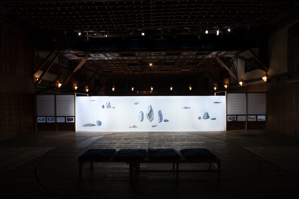 誰かが見ているものをそのまま、私は見ることができない。 他者との間には、常に翻訳のような差異が生じます。 あなたが見ているものは確かにそこに存在しているけれど、 私には全く同じように見ることができないとしたら、それは宇宙空間のどこかにただよう未発見の小惑星のようでもあります。 もしくは、かつて神山で盗まれた石でできた石庭がきっとどこかに存在していると想像することにも少し似ています。この小さな差異は石を拾う、という遊びの中にも同様のささやかな葛藤が生じることに気がつきました。今回、神山で8人に「お気に入りの石」を選んでもらいました。 それぞれの理由で選ばれた石は、2つの視点から描かれ、ドローイングとして配置されることで、石庭を構成しています。つまり、複数の視点が交錯している実際には存在しえない架空の石庭です。 それは、他者との間に設えた理想郷としての庭でもあります。しかし、この庭は現実には成立しえません。他者の視点を完全に共有することも、二つの視点から同時に世界を把握することも私たちにはできないからです。 この架空の石庭は、他者のまなざしを理解しようと手を伸ばすことと、決して完全には到達できないこと、その両方を同時に示しています。それはまさに、その不可能性のゆえにのみ存在する「非到達的ユートピア」であり、私とあなたの間にある、決してゼロにはならない距離を眺めてみたいのです。