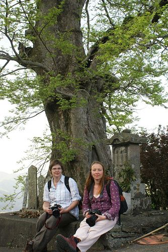 ヤマニハウスに彼女たちを迎えに行ったのが午後2時。このくらいの時間が写真撮影に一番適している時間帯だとか。まず、向かったのが以前隠れ名所で紹介した峯長瀬の大ケヤキ。彼女たちもこの巨木に圧倒されていました。