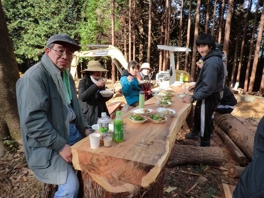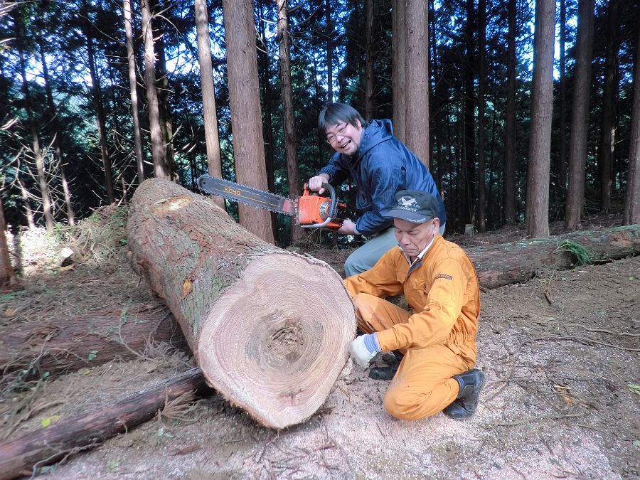 チェーンソー部隊は、まず、机の脚(あし)を作る準備にかかります。