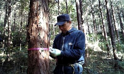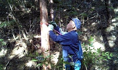 間伐する木はそのまま(東・・・・(笑))に、残す木には赤や白のテープを巻いていきます。