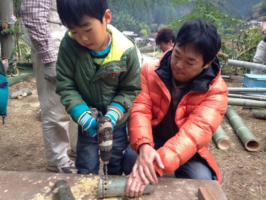 ワークショップが始まるとnoraの“下ぴー”こと下本さんのオモシロおかしな説明と小刻みに入れられるオヤジギャグ?が繰り広げられ、賑やかだけど楽しい雰囲気の中、こどもたちがのこぎりで竹を切ることに挑戦してみたり、