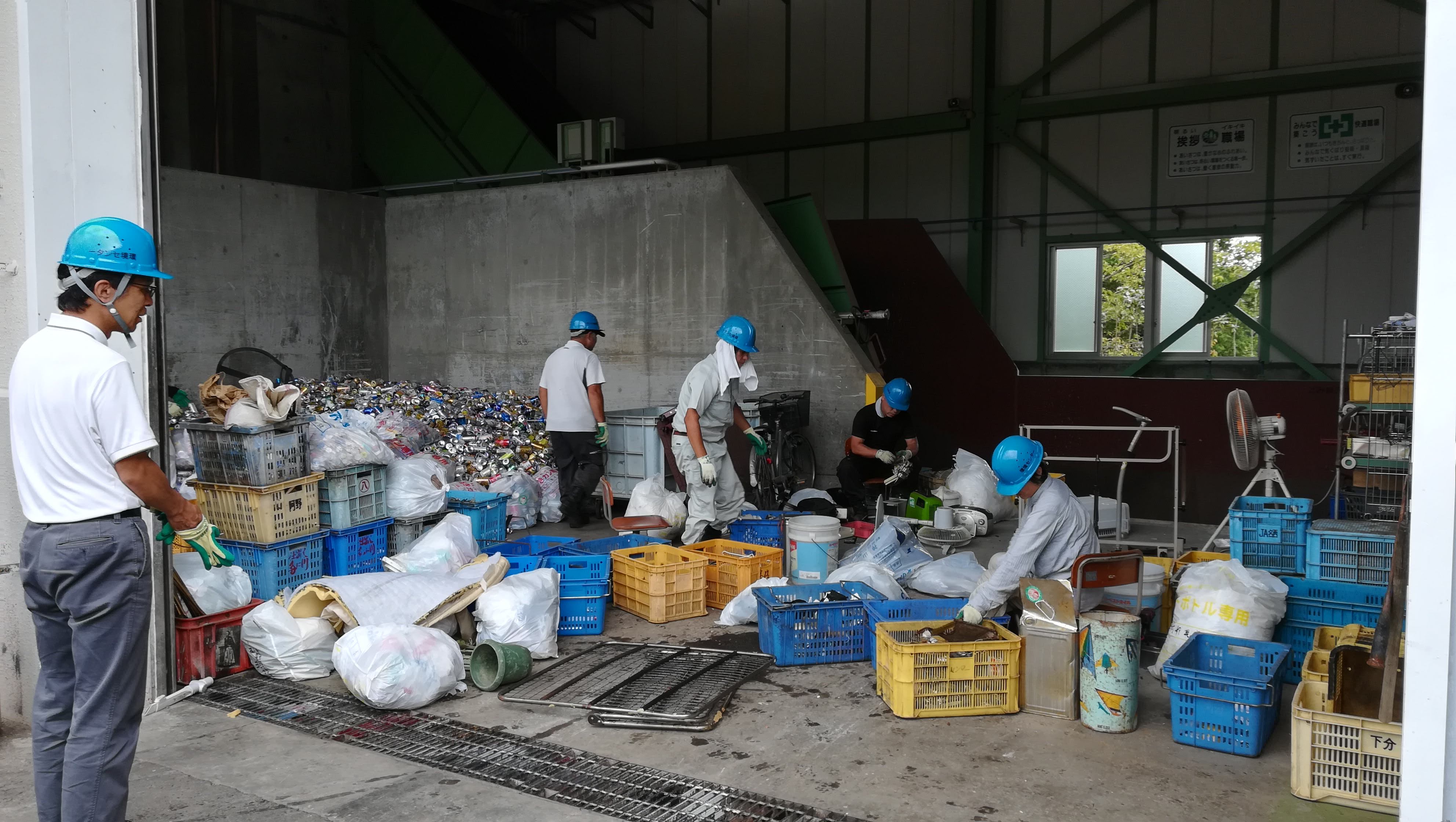 センター長から、神山町のゴミ収集・運搬とその後の処理について話を聞いた後は、粗大ゴミやその他不燃物、リサイクルできるものを分別している現場を見学。