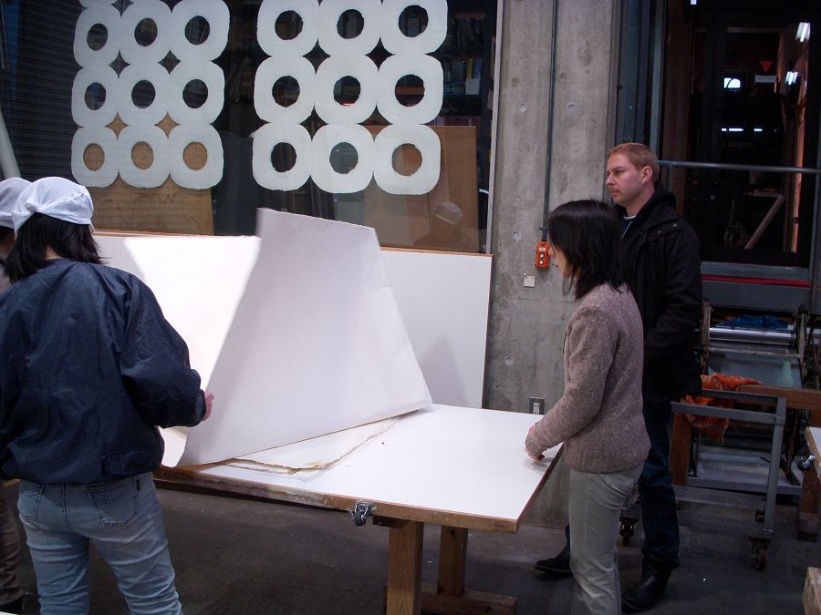 昨日、神山へ到着したアダム・アヴィカイネンさんと、山川町にある阿波和紙会館へ行ってきました。滞在中には、帰国直後ローマで個展をする際の作品を制作するようです。