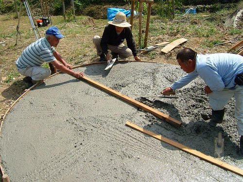 「ユンボ」にその「オペレート」、「型枠」作り、「電動のこぎり」、レベル(測量機)から、「発電機」、「一輪車」まで全部自前。「地盤を水平に作る技術」を持っている人がいて、おまけに仕上げの「左官」さんまでいる・・・。