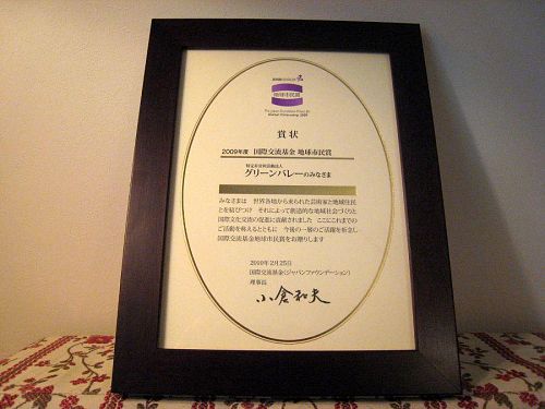2010年2月25日木曜日、2009年度国際交流基金(ジャパンファウンデ-ション)地球市民賞の授賞式が東京(国際交流基金本部)で行われ、グリーンバレーを代表して出席し、賞状と副賞(目録)をいただいて参りました。