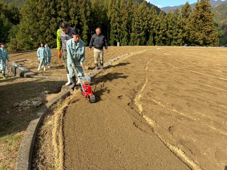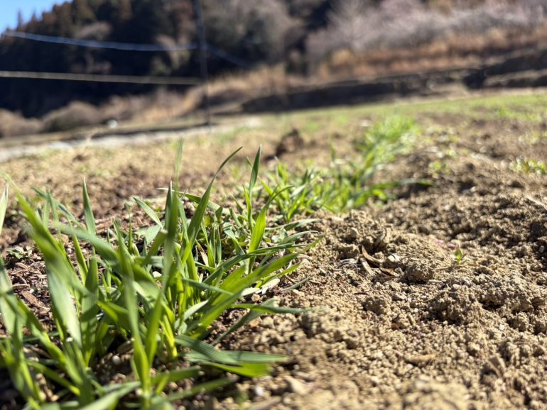 また、学校から徒歩10分のところにある元耕作放棄地「まめのくぼ」では、11月末に播いた神山小麦の種が芽を出し、順調に成長しています。