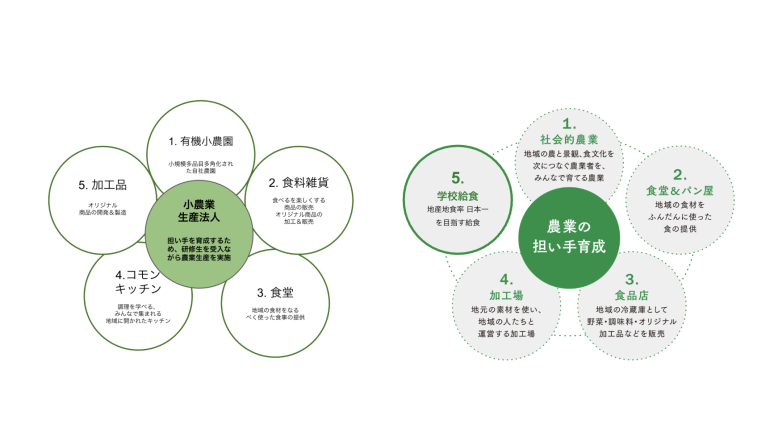 10年前に描かれたプレゼン資料には、有機小農園、食料雑貨店、食堂、コモンキッチン、加工品開発といった、現在のフードハブを構成する機能がほぼそのままの形で提示されており、明確なビジョンを持ってスタートしたことが伺えます。その目的は、神山の中の食の「自活率」を高め、地域内での経済と文化の循環を生み出すことでした。