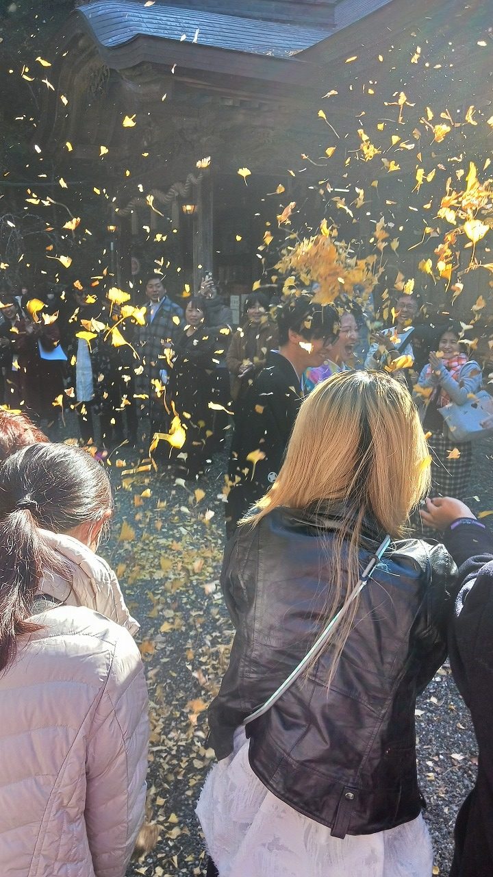 けんけん、ゆきちさん御結婚おめでとうございます! 餅投げまで居たかったのですが、銀杏シャワーの前に所用により失礼させていただきました。 拝殿前での二人の笑顔が、これからの幸せな未来が光り輝いて見えました御幸せに!