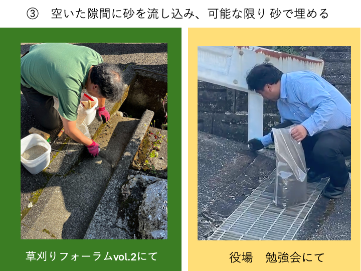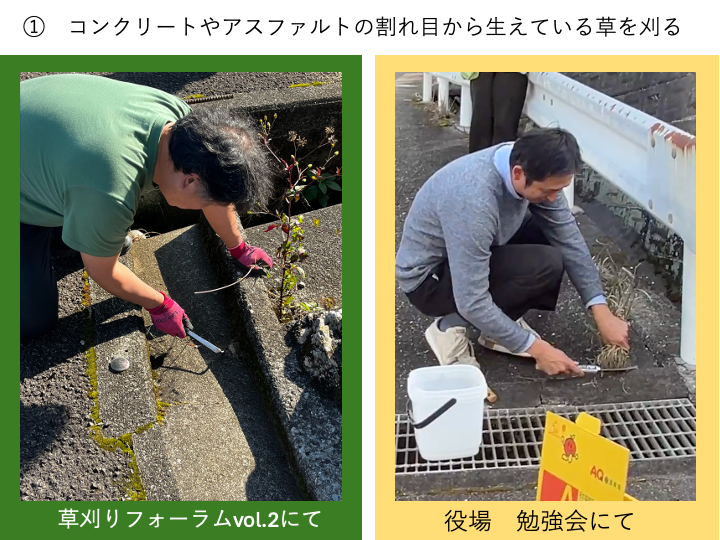 第2部では、「刈る」だけでなく、「防ぐ」「長持ちさせる」という発想の草刈りが紹介されました。用水路や道路の割れ目を補修し、草が生えにくい状態をつくることや、環境に配慮した方法で草と向き合うことは、地域のインフラや暮らしを守ることにもつながります。