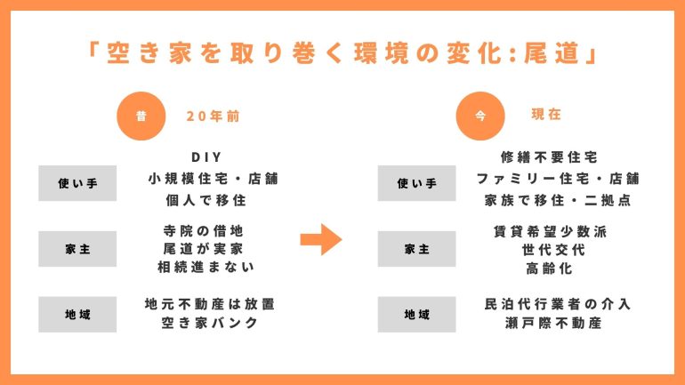 尾道と神山、二つの別々の地域と「昔」と「今」という軸で空き家が置かれている状況を相対化し、空き家を取り巻く環境がどのような変化を遂げているのかを考察しました。