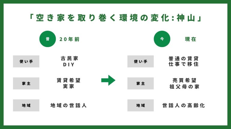 そして、最終的には空き家を売買したい家主さんにとっても、無理のないマッチングが可能になる。そうすることによって空き家が再生されて、神山に人が入ってくる。このようなサイクルが人にとっても空き家にとっても健康的かつ持続的なのだと思います。