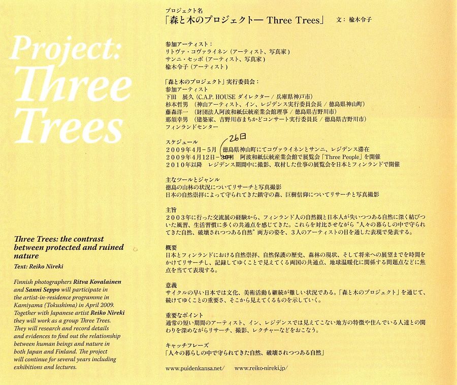 Three artists who have spent many years collaborating together, Finnish photographers Ritva Kovalainen, Sanni Seppo, and Japanese artist Reiko Nireki, will be starting a new long-term project in Tokushima in Spring 2009 called “Three Trees: The Contrast between Protected and Ruined Nature.” The three are participating in the Kamiyama Artist in Residence Program in order to explore the animist legends of Tokushima.